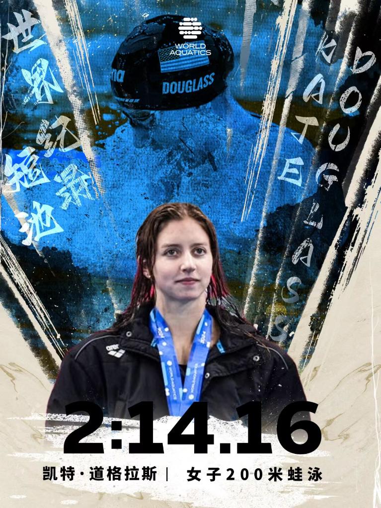 美國的奧運(yùn)冠軍道格拉斯在女子200米蛙泳決賽中以2分14秒16打破短池世界紀(jì)錄并奪冠,她還在100米混合泳決賽中技壓群芳奪魁,繼續(xù)領(lǐng)跑世界杯女選手積分榜。