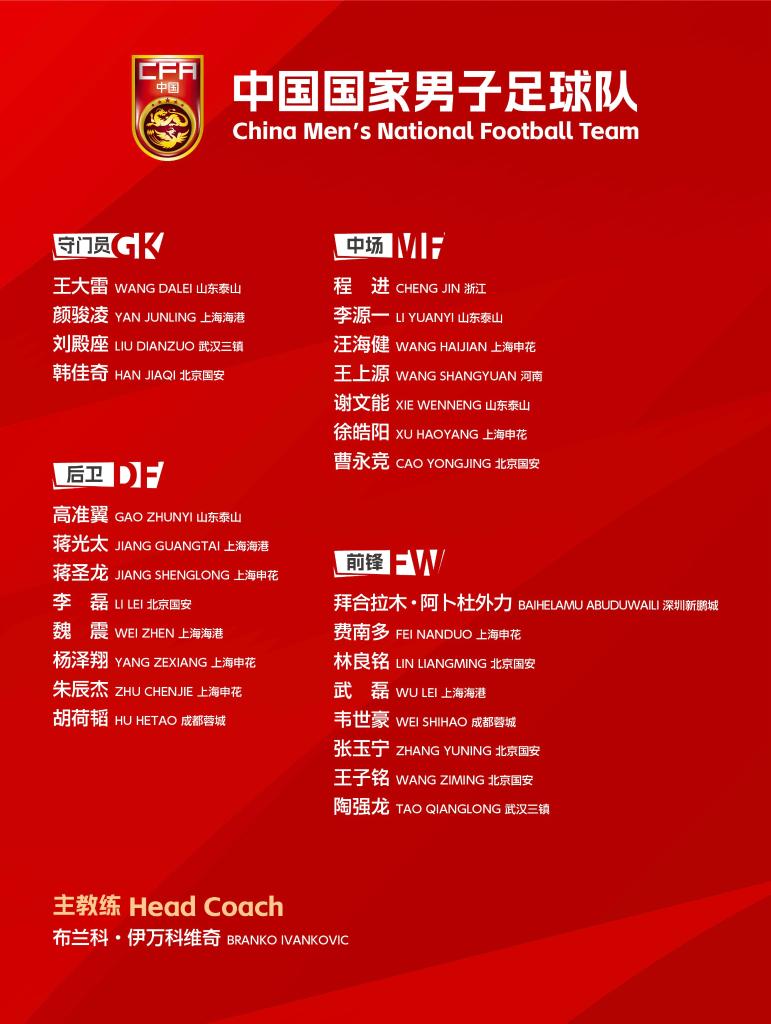 武磊、顏駿凌、蔣光太、魏震(上海海港),王大雷、李源一、高準(zhǔn)翼、謝文能(山東泰山),程進(jìn)(浙江),韋世豪、胡荷韜(成都蓉城),費(fèi)南多、楊澤翔、徐皓陽(yáng)、朱辰杰、蔣圣龍、汪海健(上海申花),李磊、張玉寧、林良銘、王子銘、曹永競(jìng)、韓佳奇(北京國(guó)安),劉殿座、陶強(qiáng)龍(武漢三鎮(zhèn)),王上源(河南),拜合拉木·阿卜杜外力(深圳新鵬城)。