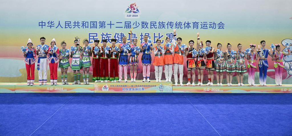 11月28日,這是第十二屆全國(guó)少數(shù)民族傳統(tǒng)體育運(yùn)動(dòng)會(huì)民族健身操自選套路(輕器械)頒獎(jiǎng)儀式現(xiàn)場(chǎng)。新華社記者 孫凡越 攝 有一種舞蹈無(wú)需編排也可以精彩紛呈,那便是各族人民在一起的親情之舞。在民族健身操自選套路第二輪競(jìng)演后,得到全場(chǎng)最高分的西藏隊(duì)興奮地敲響手中的熱巴鼓,領(lǐng)隊(duì)開(kāi)心地為隊(duì)員們戴上哈達(dá)。 山東隊(duì)圍攏了過(guò)來(lái),向西藏隊(duì)送上誠(chéng)摯祝賀,西藏隊(duì)隊(duì)員們隨后把脖子上的哈達(dá)摘下,為山東隊(duì)隊(duì)員們戴上,又拉著他們的手,熱情地邀請(qǐng)他們一起跳舞。 “我們相聚在這里,把我們的民族亮給全世界……”用藏語(yǔ)唱起《我們相聚在一起》后,各族運(yùn)動(dòng)員紛紛加入,現(xiàn)場(chǎng)的配樂(lè)也切換成了《相親相愛(ài)》。