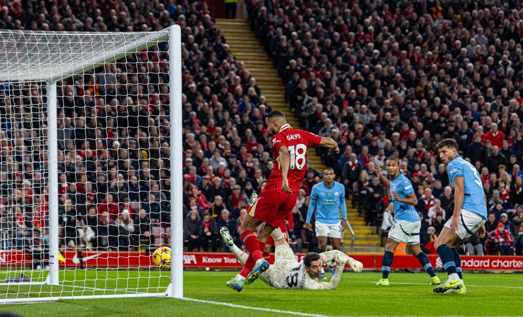 坐鎮(zhèn)主場(chǎng)的“領(lǐng)頭羊”利物浦全場(chǎng)占據(jù)主動(dòng)。第11分鐘,范迪克的頭球擊中門柱彈出,曼城躲過一劫。主隊(duì)1分鐘后長(zhǎng)傳策動(dòng)反擊,薩拉赫禁區(qū)右肋橫傳,加克波后點(diǎn)包抄得手。