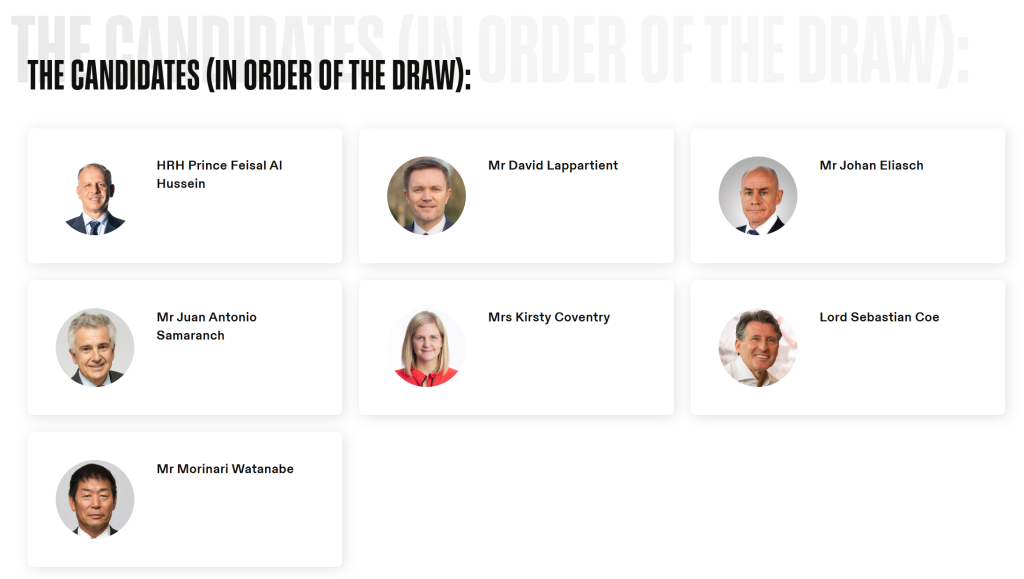 在國際奧委會近131年的歷史上,一共產生過九位主席,其中八人來自歐洲,另外一位來自美國。根據《奧林匹克憲章》,主席候選人必須是現(xiàn)任國際奧委會委員。本次參與競選的共有七人,其中歐洲四人,分別是國際奧委會副主席小薩馬蘭奇(65歲,西班牙)、世界田聯(lián)主席塞巴斯蒂安·科(68歲,英國)、國際自行車聯(lián)盟主席大衛(wèi)·拉帕爾蒂安(51歲,法國)和國際雪聯(lián)主席約翰·埃利亞施(63歲,瑞典和英國雙重國籍);亞洲兩人,分別是國際奧委會執(zhí)委費薩爾·侯賽因(61歲,約旦)和國際體操聯(lián)合會主席渡邊守成(66歲,日本);非洲一人,國際奧委會執(zhí)委、運動員委員會前主席柯絲蒂·考文垂(41歲,津巴布韋)。