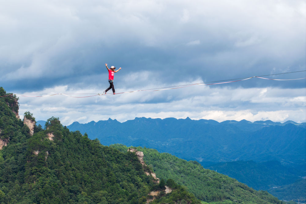 比賽時,選手們系上安全繩后,從懸崖邊起步,走上一指多寬、約2毫米厚的扁帶。按照比賽規(guī)則,選手需在3次掉落次數內完成1000米距離行走,用時最短者獲勝。
