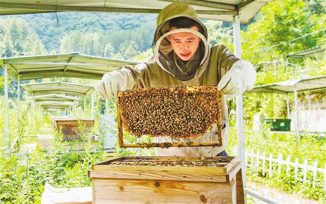 △石柱縣中益鄉(xiāng),蜂農(nóng)查看蜜蜂生長和產(chǎn)蜜情況。