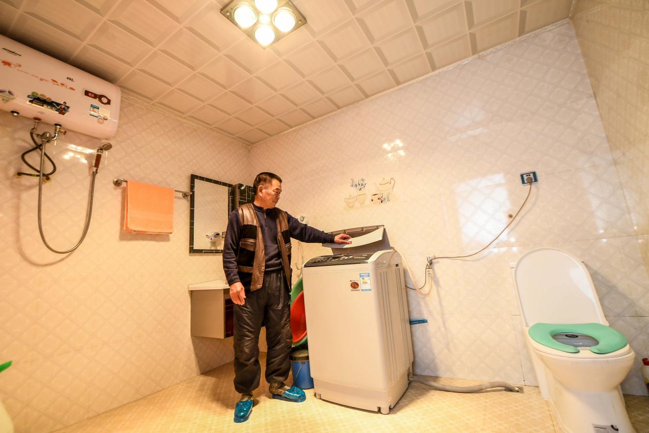 2017年1月24日,吉林延邊光東村村民全得成在自家衛(wèi)生間內(nèi)使用洗衣機。