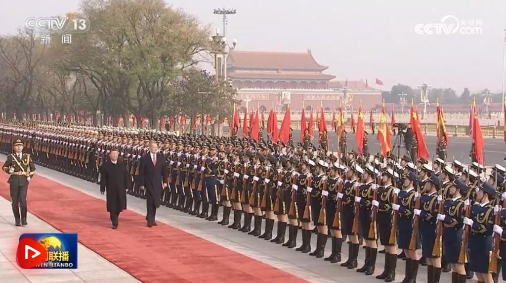 費(fèi)利佩六世抵達(dá)時(shí),禮兵列隊(duì)致敬。習(xí)近平同費(fèi)利佩六世登上檢閱臺(tái),軍樂(lè)團(tuán)奏中西兩國(guó)國(guó)歌,天安門(mén)廣場(chǎng)鳴放禮炮21響。費(fèi)利佩六世在習(xí)近平陪同下檢閱中國(guó)人民解放軍儀仗隊(duì),并觀看分列式。