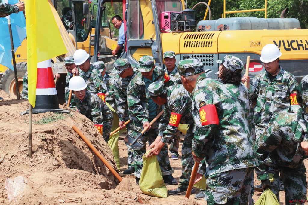 6月12日,原平市交通建設(shè)中心舉行了防汛應(yīng)急搶險演練,檢驗了全體職工防汛搶險組織能力、快速反應(yīng)能力和現(xiàn)場操作能力,全力確保安全度汛。圖為演練人員裝土袋搶修變道。(劉建春 攝)