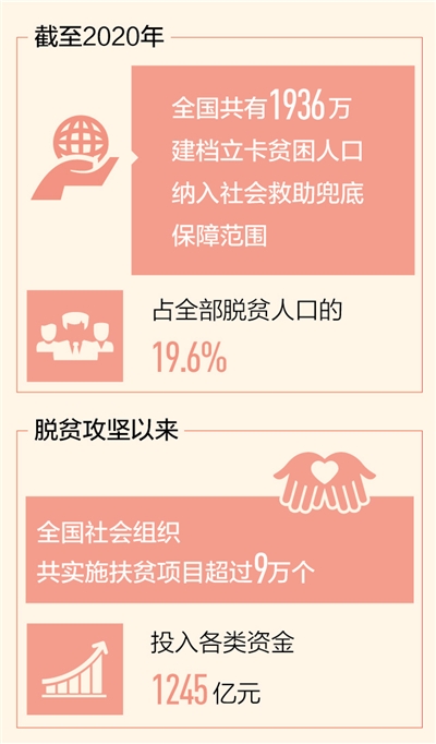 習(xí)近平總書記指出,民政工作關(guān)系民生、連著民心,是社會(huì)建設(shè)的兜底性、基礎(chǔ)性工作。決戰(zhàn)決勝脫貧攻堅(jiān),民政部門以完善制度機(jī)制、聚焦特殊群體、助力重點(diǎn)地區(qū)攻堅(jiān)等政策“組合拳”,兜住最困難群體,保住最基本生活。數(shù)據(jù)顯示,截至2020年,全國共有1936萬建檔立卡貧困人口納入社會(huì)救助兜底保障范圍,占全部脫貧人口的19.6%,脫貧地區(qū)群眾獲得感、幸福感、安全感不斷提升。
