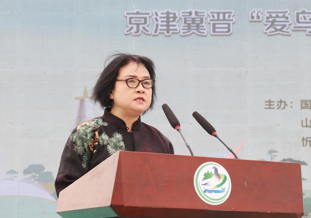 閆春麗致辭。范濤 攝 閆春麗致辭并宣布京津冀晉“愛鳥周”聯(lián)合宣傳活動暨山西省第42屆“愛鳥周”啟動。她說,京津冀晉山脈相連、林草交錯,為鳥類生存繁衍和自然進化提供了得天獨厚的自然條件。四省市要齊心抓好野生動植物大保護平臺建設(shè),共同下好區(qū)域野生動植物保護事業(yè)協(xié)同發(fā)展一盤棋,為華北豹、褐馬雞等旗艦物種在區(qū)域內(nèi)自由漫步、繁衍生息,打破空間阻隔、打通生態(tài)廊道、打造適生環(huán)境,攜手邁上林草高質(zhì)量發(fā)展新臺階。