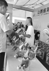 開幕式前,提前一兩個(gè)小時(shí)安檢入場(chǎng)的觀眾,遠(yuǎn)遠(yuǎn)就看到“翔翔”的召喚,紛紛在吉祥物專營(yíng)區(qū)扎堆?!?8元一個(gè),就剩30個(gè)了?!睂I(yíng)區(qū)的售賣者告訴山西晚報(bào)記者,他們也沒想到這只褐馬雞如此受歡迎,很快就要被搶沒了。大同的趙女士搶到一個(gè),她說朋友從外地剛回來(lái)不方便出門,讓她買一個(gè)留作紀(jì)念。