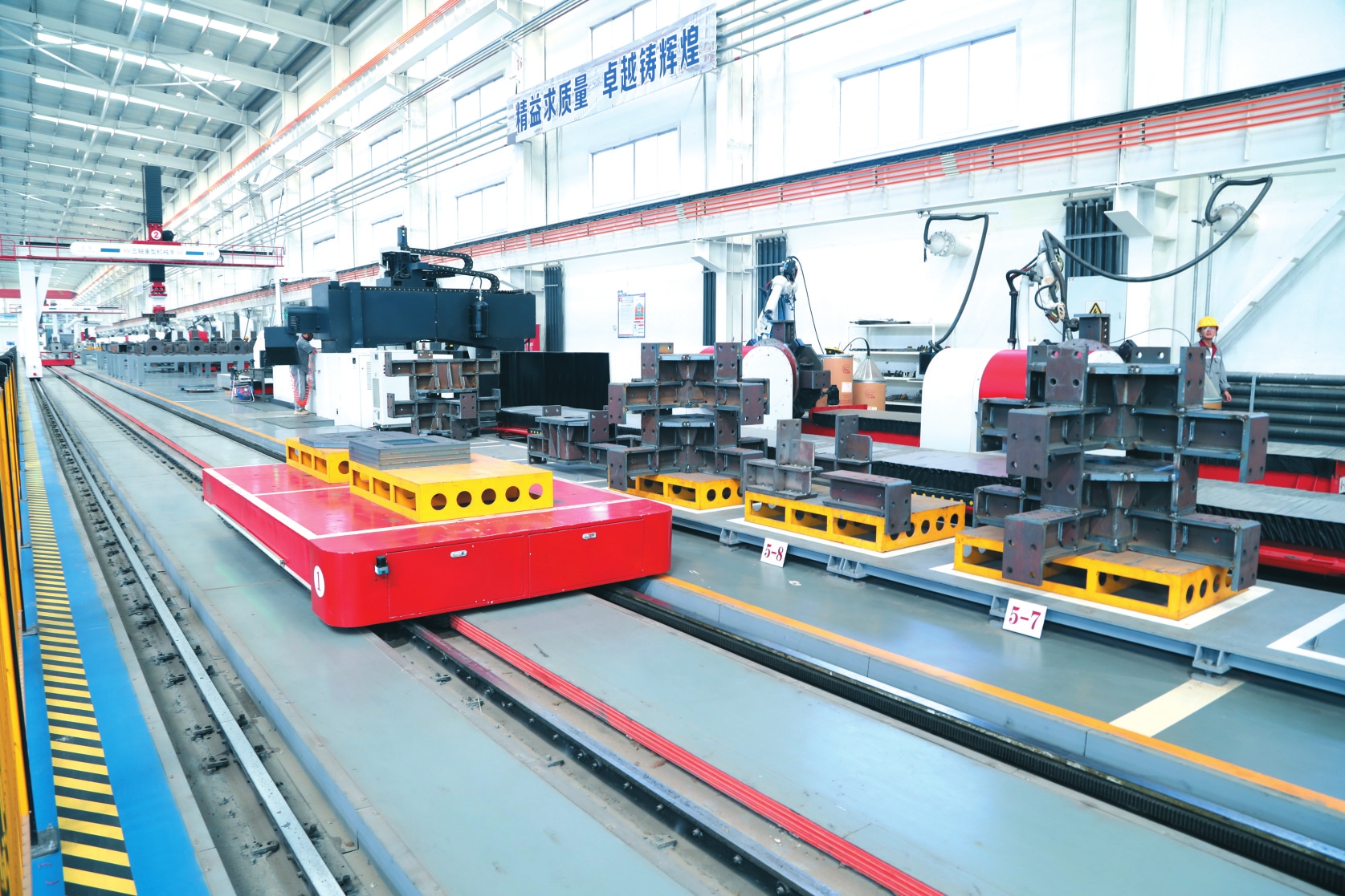 宏厚鋼節(jié)點(diǎn)智能生產(chǎn)線。楊 帆攝 在山西宏厚裝配式建筑科技發(fā)展集團(tuán)有限公司產(chǎn)業(yè)園區(qū)采訪,耳聞目睹令人大開眼界。 建筑是個傳統(tǒng)產(chǎn)業(yè),什么叫“裝配式建筑”?建筑又是個勞動密集型產(chǎn)業(yè),跟“科技”有什么關(guān)系? 百年前,中國引入鋼筋混凝土技術(shù)。20世紀(jì)80年代,“秦磚漢瓦”退出歷史舞臺。2016年,國務(wù)院發(fā)布《關(guān)于大力發(fā)展裝配式建筑的指導(dǎo)意見》。2019年,領(lǐng)風(fēng)氣之先的宏厚集團(tuán)成立。從2020年開始,占地近560畝的宏厚集團(tuán)產(chǎn)業(yè)園區(qū)開工興建。目前,園區(qū)內(nèi)已建成PC預(yù)制構(gòu)件智能工廠、鋼結(jié)構(gòu)智能工廠,并全部投產(chǎn)。 宏厚集團(tuán)研發(fā)出一種“民用建筑鋼結(jié)構(gòu)端板搭階(SEP)體系”——通過智能化、全自動生產(chǎn)線生產(chǎn)鋼柱、鋼梁、樓板、外墻板、內(nèi)墻板及預(yù)制組合衛(wèi)生間等核心構(gòu)件,將這些構(gòu)件運(yùn)至建筑工地現(xiàn)場安裝,是謂“裝配式建筑”。鋼結(jié)構(gòu)智能工廠的兩條生產(chǎn)線足足有320多米長,由環(huán)環(huán)緊扣的智能下料分揀、部件組裝焊接、成品組裝焊接、端面精銑、智能噴涂等工作站組成。說是“工作站”,卻不見一個工人,所有工序均由集控中心控制。 比如智能下料分揀工作站,主要由激光切割機(jī)、視覺分揀機(jī)械手、三軸機(jī)械手RGV車(有軌制導(dǎo)車輛)等設(shè)備構(gòu)成。激光切割機(jī)將鋼材根據(jù)用途切割成大小不同的鋼板后,視覺分揀機(jī)械手將其分門別類揀到相應(yīng)托盤碼垛,三軸機(jī)械手分別抓取放到RGV車上,轉(zhuǎn)運(yùn)至下一工作站。 比如全流程智能化作業(yè)的鋼結(jié)構(gòu)構(gòu)件成品焊接生產(chǎn)線,通過三軸機(jī)械手、雙軸旋轉(zhuǎn)變位機(jī)、焊接機(jī)器人等智能設(shè)備實現(xiàn)精準(zhǔn)組裝、焊接。經(jīng)激光檢測確保構(gòu)件精度后,由打磨機(jī)械手完成自動化焊縫處理,再通過端面精銑和拋丸工藝提升成品質(zhì)量,最后在全封閉的智能噴涂工作站完成涂裝烘干。構(gòu)件精度,居然精確到“絲”。 更了不起的是,這些關(guān)鍵工藝100%自動化的智能工廠,從生產(chǎn)線到獨(dú)立工作站的全鏈條,均由宏厚集團(tuán)自主研發(fā),涵蓋所有的智能聯(lián)動設(shè)備及中央控制系統(tǒng)。全流程自動化操作,極少人工干預(yù),在保證產(chǎn)品精度的同時實現(xiàn)了批量化高效生產(chǎn)。 與鋼筋混凝土建筑相比,鋼結(jié)構(gòu)建筑安全系數(shù)高、抗震性能好、節(jié)能效益高——可減少30%的能耗、80%的揚(yáng)塵污染和80%的建筑垃圾,工期也可縮短1/3以上。目前,英國鋼結(jié)構(gòu)建筑占比達(dá)到70%,美國達(dá)到50%以上,而我國只有5%左右。在中國,鋼結(jié)構(gòu)建筑具有巨大的市場潛力和良好的發(fā)展前景。 宏厚集團(tuán)董事長楊文朝20多年前來忻州創(chuàng)辦禹王煤炭氣化有限公司,不僅將其打造成忻府區(qū)規(guī)模最大、貢獻(xiàn)最多的骨干企業(yè),還將其打造成晉西北最大的綜合性煤化工企業(yè)。而宏厚集團(tuán)不僅是一家智能化的高新技術(shù)企業(yè),更是這個新興產(chǎn)業(yè)業(yè)內(nèi)的“巨無霸”。 集團(tuán)下設(shè)五個全資子公司,涵蓋建筑科技、建材科技、固廢再生加工、儲運(yùn)服務(wù)、智能裝備等行業(yè)全鏈條。集團(tuán)下設(shè)三個研發(fā)中心:裝配式建筑體系研發(fā)中心、裝配式綠色建材研發(fā)中心、裝配式建筑專用設(shè)備研發(fā)中心。極其雄厚的技術(shù)力量,確保企業(yè)在體系研發(fā)、標(biāo)準(zhǔn)化設(shè)計、集成化應(yīng)用、智能裝備制造、構(gòu)件智能化生產(chǎn)、固廢綜合利用、部品裝配式安裝等產(chǎn)業(yè)全鏈條技術(shù)全域領(lǐng)先。集團(tuán)擁有的6項發(fā)明專利、80項實用新型專利、3項外觀設(shè)計專利,被廣泛應(yīng)用在建筑鋼結(jié)構(gòu)等產(chǎn)品生產(chǎn)、加工的方方面面。為降低物流成本,集團(tuán)還專門投資建設(shè)了一條智慧物流集裝箱鐵路專用線,這對同類企業(yè)來說可望而不可及。 宏厚集團(tuán)正在興建的員工宿舍樓可以視作“鋼結(jié)構(gòu)裝配式建筑”的“樣板房”。工地上的員工,與其說是建筑工人,不如說安裝工人。一層與一層之間的鋼柱通過內(nèi)凹法蘭板、凸臺法蘭板連接,鋼梁與鋼柱通過階梯型節(jié)點(diǎn)連接,均用高強(qiáng)度螺栓緊固。這種“裝配式端板搭階鋼結(jié)構(gòu)體系”通過清華大學(xué)“端板搭階梁柱節(jié)點(diǎn)試驗”,具有優(yōu)異的抗震性能,如此建筑框架,真?zhèn)€是“鋼筋鐵骨”。全部建筑的外墻板和內(nèi)墻板,均由輕質(zhì)混凝土與鋼筋網(wǎng)片結(jié)合,兼具保溫、隔音和防火等功能。每一層建筑面積1200平方米,不到一周時間安裝完畢——工業(yè)化、標(biāo)準(zhǔn)化、智能化生產(chǎn)帶來高速度、高質(zhì)量、低污染。宏厚集團(tuán)的“鋼結(jié)構(gòu)裝配式建筑”建設(shè)周期短、施工現(xiàn)場環(huán)境好、粉塵噪音接近零污染,無廢水、現(xiàn)場無焊接。 宏厚集團(tuán)——這家除電機(jī)、電線、電纜外全部自己研發(fā)、設(shè)計、