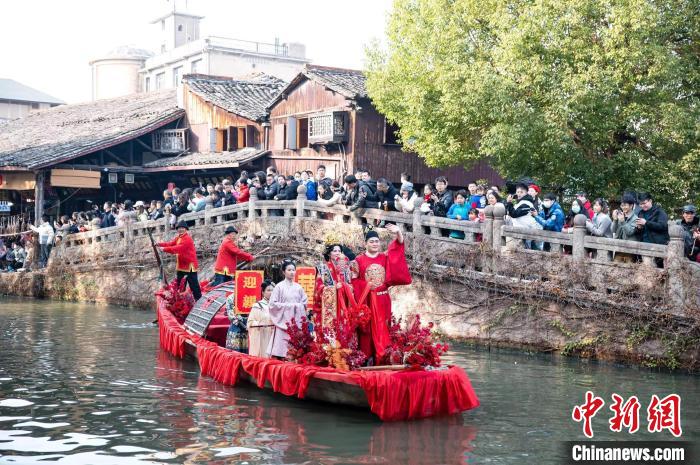 在浙江紹興安昌古鎮(zhèn),記者到訪時(shí),在碧水之上,一場(chǎng)明制婚禮正在舉行,再現(xiàn)了烏篷船接親的當(dāng)?shù)鼗樗?。從單純表演到定制化服?wù),今年“五一”假期就有新人預(yù)訂了自己的水上婚禮。