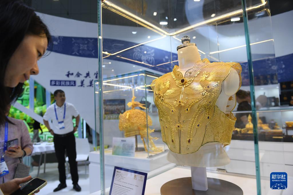 ?5月23日,觀眾在第二十屆文博會上觀看展出的龍鳳霞帔金衣。(新華社記者 毛思倩 攝)