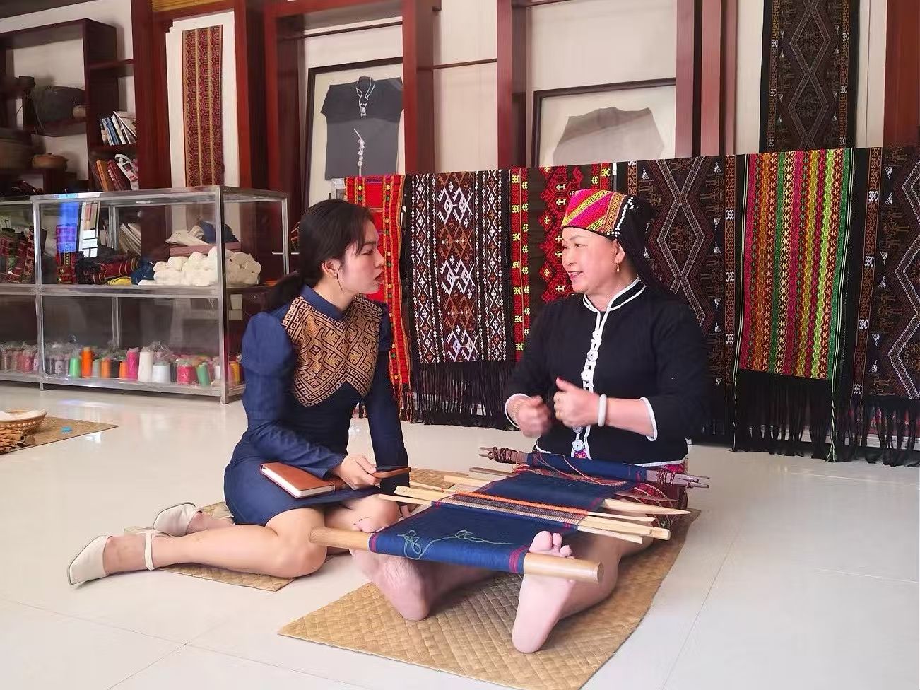 黎族傳統(tǒng)紡染織繡技藝國(guó)家級(jí)傳承人劉香蘭(右)正在和陳孟麗(左)交流。 受訪者供圖