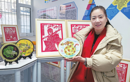 當(dāng)日,下站街道文化活動(dòng)室五顏六色、惟妙惟肖的彩色剪紙作品,也讓之前只見(jiàn)過(guò)紅色剪紙作品的記者眼前一亮。“這是染色剪紙。制作之前,需要先在白紙上起稿。剪出來(lái)后,會(huì)根據(jù)不同部位的特點(diǎn)進(jìn)行上色,讓作品更加生動(dòng)、更加活靈活現(xiàn)?!倍绶冀榻B,這次剪紙活動(dòng)也是街道“非遺賀新春”主題活動(dòng)的一部分,圍繞蛇年主題系列進(jìn)行創(chuàng)作。