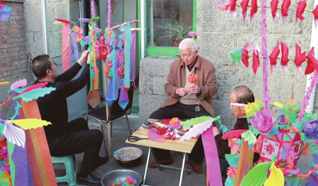 記者在現(xiàn)場看到,制作好的炮燈上有飄帶、繡球等裝飾,每盞炮燈不盡相同,畫有禾苗、動物等不同圖案,寓意五谷豐登、六畜興旺,“孔雀展翅”“雄羊抵頭”“駿馬奔馳”等主題的炮燈活靈活現(xiàn)。“在我的記憶里,我們村年年都有制作手工炮燈的傳統(tǒng),保存好的炮燈能用上兩年,燈架能代代相傳,我們有義務將這種技藝傳承發(fā)揚下去……”67歲的村民翟慶如是村里制作炮燈的“行家”,他現(xiàn)場拿起一張彩紙給記者折起了炮燈上的裝飾。