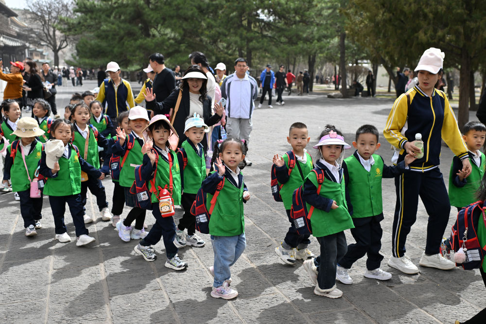 4月16日,在云岡石窟,小朋友在老師的帶領(lǐng)下參觀。