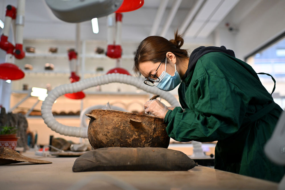 4月15日,在云岡研究院可移動(dòng)文物修復(fù)室,工作人員在進(jìn)行除塵作業(yè)。