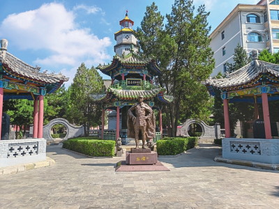 穿過大門,一座約3米高的古銅色左權(quán)將軍塑像巍然屹立。將軍身披軍大衣,目光堅定地望向遠方,仿佛仍在守護這片曾經(jīng)戰(zhàn)斗過的土地。塑像后方,蒼松翠柏掩映著亭臺廊廡,肅穆之感油然而生。
