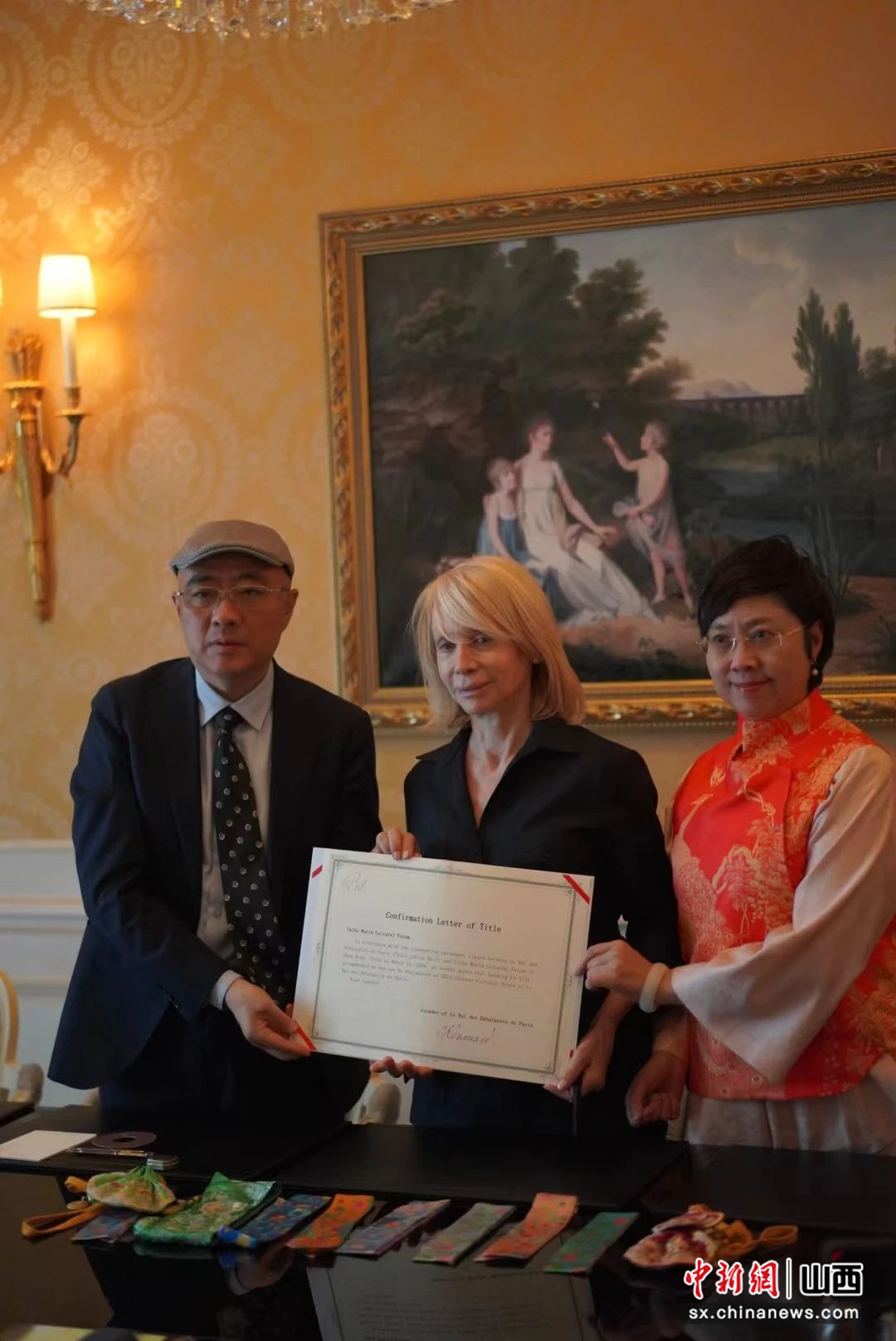 潞綢技藝傳承人、潞安府潞綢集團(tuán)董事長(zhǎng)王淑琴,太湖世界文化論壇常務(wù)理事、中國(guó)琺華技藝傳承人于山向巴黎名媛舞會(huì)創(chuàng)始人奧菲莉·雷努阿贈(zèng)送潞綢、琺華工藝品。