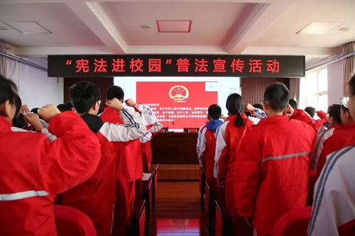 “我宣誓:忠于中華人民共和國憲法,維護(hù)憲法權(quán)威,履行法定職責(zé),忠于祖國、忠于人民……”授課結(jié)束后,全場人員緊握右拳,莊嚴(yán)宣誓,字字千鈞、擲地有聲的鏗鏘誓言在會(huì)場久久回蕩,充分表達(dá)了大家對(duì)憲法的信仰、尊崇與敬畏。隨后,法院干警向?qū)W生們發(fā)放了中院精心制作的憲法、平安建設(shè)、防范校園欺凌、未成年人保護(hù)、預(yù)防未成年人犯罪等法律知識(shí)宣傳手冊(cè)。