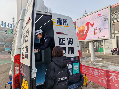 春節(jié)假期,城市、鄉(xiāng)村到處都彌漫著歡樂祥和的氣氛,初一至初七,在山西省忻州市忻府區(qū)光明西街古城北廣場、公園西街世紀花苑小區(qū)南門等人流量大、人員集中場所,忻州市公安局交警支隊的警郵車管便民服務(wù)車格外顯眼?!翱s短距離、延伸真情”,這輛承載著為駕駛?cè)颂峁崆橹艿椒?wù)、為車輛安全出行提供保障,被群眾稱為“流動車管所”的車管便民服務(wù)車讓寒冬暖流涌動。