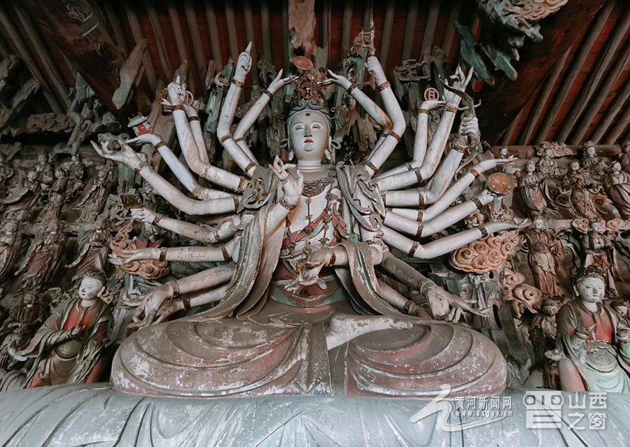寺內擁有總計2000多尊彩塑,大者丈余、小者尺許,每一壁龕為一獨立神話或佛教故事,人物造型生動,神態(tài)逼真,尤其以“千手觀音像”與“韋馱像”最為經(jīng)典。舞蹈《千手觀音》的靈感原型就是這尊千手觀音像。塑像高達數(shù)米,全身貼金,背后伸出上千只手臂,每只手掌上都有一只眼睛,錯落有致,整個造像氣勢恢宏,達到雕塑藝術中和諧、完美的境界。韋馱像巍然肅立,身披甲胄,神情凝重,整個身體呈現(xiàn)出一種微妙的動態(tài)平衡,是明代彩塑中少見的藝術杰作,被譽為“天下第一韋馱”“全國韋馱之冠”。景區(qū)講解員侯麗娟介紹:“這尊塑像的高明之處就在于匠師不落俗套,打破了一般程式的限制,賦予了韋馱一種時間的節(jié)奏性和動作的連續(xù)性,產(chǎn)生了雕塑作品的最高境界‘不動之動’?!?/p>