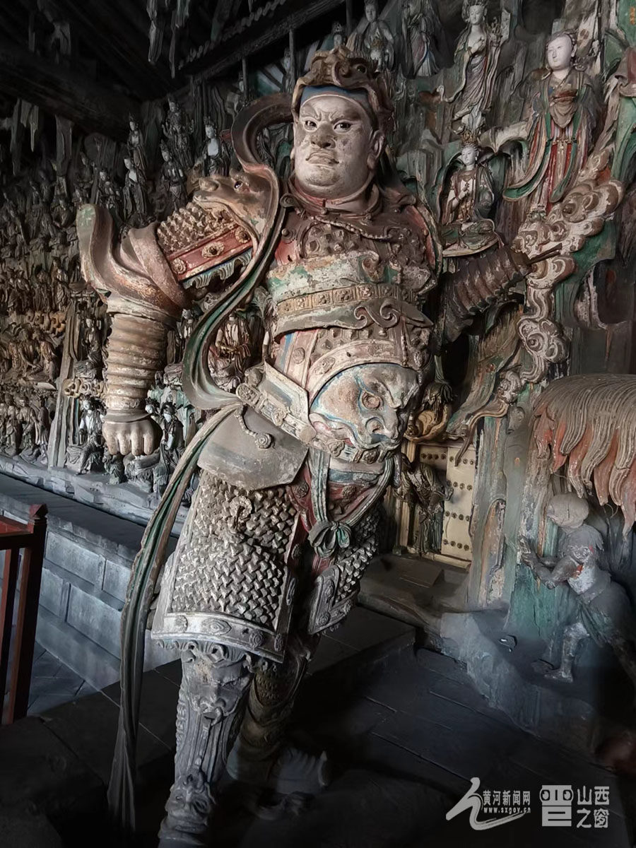 此外,雙林寺內還有許多頗具觀賞價值的彩塑,譬如千佛殿內“自在觀音像”,她以極為放松的姿態(tài)坐臥在蓮臺上,面頰圓潤,微微注視前方,流露出怡然自得之態(tài),武圣殿內的關羽、張飛、趙云等三國人物像,天王殿內的四大天王像,也各具特色,分別代表了不同時代的彩塑風格和文化寓意。據(jù)侯麗娟介紹,因為雙林寺是民間寺院,古代工匠在塑像造型和空間利用上具有更大的靈活性,所以雙林寺的塑像才會集古代彩塑之大成,成為今天人們研究彩塑的重要史料。