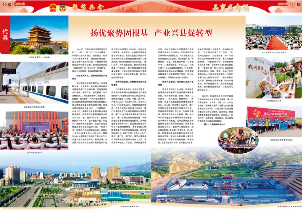 轉(zhuǎn)變發(fā)展方式,積極構(gòu)筑現(xiàn)代產(chǎn)業(yè)體系面對(duì)繁重的改革發(fā)展任務(wù),代縣著眼全局,立足實(shí)際,堅(jiān)持健全因地制宜發(fā)展新質(zhì)生產(chǎn)力體制機(jī)制,把構(gòu)筑涉鐵全產(chǎn)業(yè)鏈、黃酒產(chǎn)業(yè)、特優(yōu)種養(yǎng)、農(nóng)產(chǎn)品精深加工、現(xiàn)代旅游康養(yǎng)、非遺文化、新能源、現(xiàn)代服務(wù)“八大產(chǎn)業(yè)支撐體系”作為加快縣域經(jīng)濟(jì)轉(zhuǎn)型升級(jí)的重要路徑,著力增強(qiáng)高質(zhì)量發(fā)展后勁和支撐。培育達(dá)限達(dá)規(guī)重點(diǎn)企業(yè)10戶(hù)、“專(zhuān)精特新”企業(yè)2戶(hù),非煤礦山企業(yè)整治整合重組穩(wěn)步推進(jìn);改造提升及新建高標(biāo)準(zhǔn)農(nóng)田2.98萬(wàn)畝,推廣優(yōu)種38萬(wàn)畝,糧食機(jī)耕面積34.8萬(wàn)畝,全年糧食產(chǎn)量2.34億斤,特優(yōu)種養(yǎng)全面鋪開(kāi);農(nóng)業(yè)產(chǎn)業(yè)化省級(jí)重點(diǎn)龍頭企業(yè)突破至6家,“代縣小米”獲得農(nóng)產(chǎn)品地理標(biāo)志認(rèn)證,縣級(jí)以上龍頭企業(yè)營(yíng)業(yè)收入4.31億元,增幅29.8%;26家非遺工坊綜合產(chǎn)值達(dá)6億元,非遺文化產(chǎn)業(yè)多點(diǎn)開(kāi)花、聯(lián)動(dòng)發(fā)展;全縣投入運(yùn)營(yíng)和正在建設(shè)中的新能源產(chǎn)業(yè)項(xiàng)目裝機(jī)總?cè)萘窟_(dá)2670MW,農(nóng)村電商公共服務(wù)、物流配送、電商銷(xiāo)售等體系建設(shè)加快推進(jìn),配備云監(jiān)控及數(shù)據(jù)可視化系統(tǒng)的代縣電商物流倉(cāng)儲(chǔ)分揀中心建成投用;集大原高鐵雁門(mén)關(guān)站開(kāi)通,“雁門(mén)關(guān)號(hào)”列車(chē)冠名首發(fā),群眾出行更加便捷。產(chǎn)城融合、數(shù)字賦能等轉(zhuǎn)型變量疊加集聚,代縣經(jīng)濟(jì)在承壓前行中展現(xiàn)出強(qiáng)大韌性,呈現(xiàn)出筑底企穩(wěn)、回升向好的發(fā)展態(tài)勢(shì)。